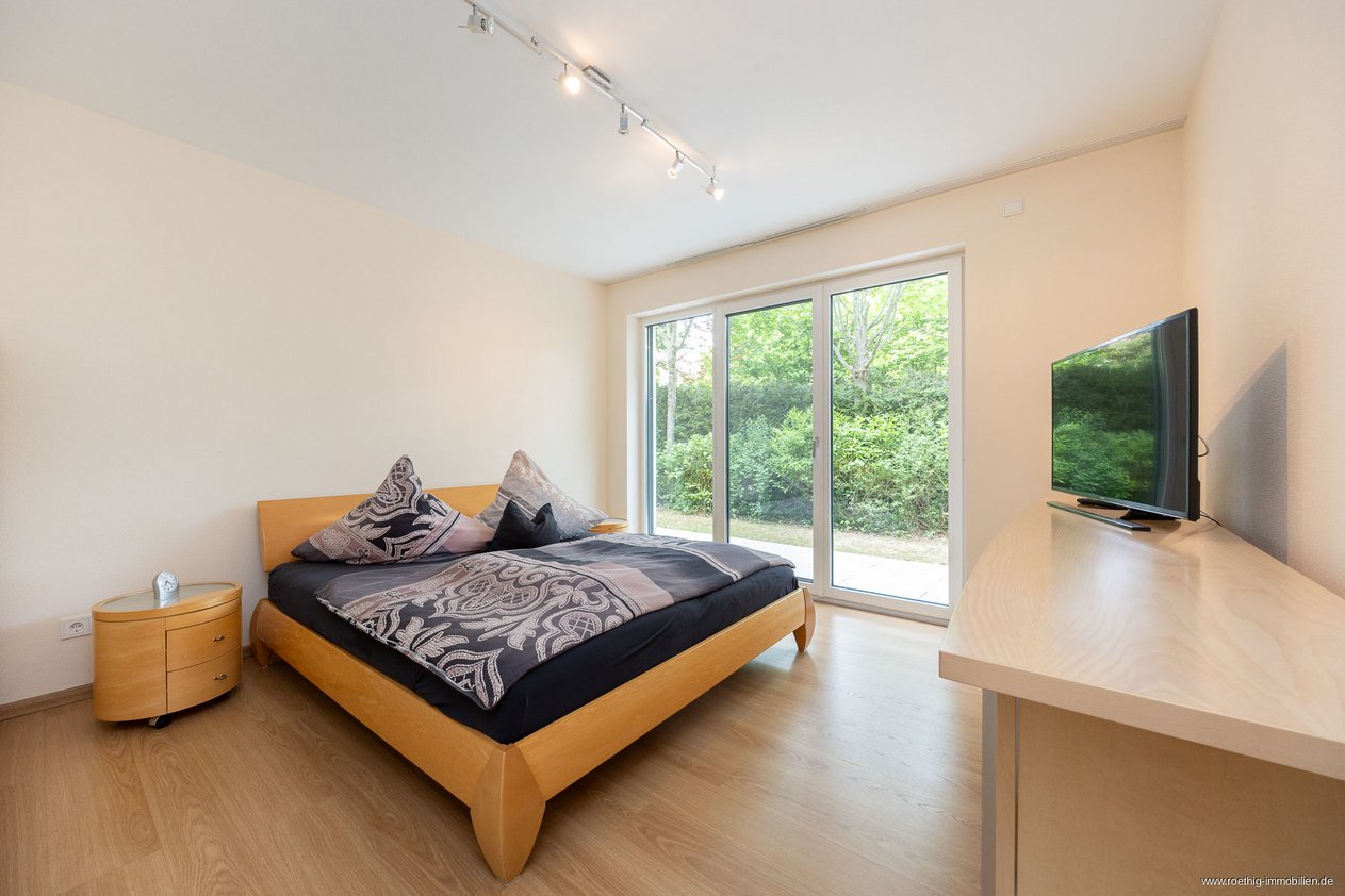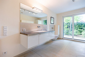 Die separat zugängliche Einliegerwohnung mit ca. 88 m² Wohnfläche liegt dank Hanglage ebenerdig. Sie bietet einen Eingangsflur, ein exklusives Bad mit Waschmaschinenanschluss, ein lichtdurchflutetes Schlafzimmer sowie einen offenen Wohn-, Ess- und Küchenbereich mit hochwertiger Einbauküche und hellem Raumkonzept. Alle Räume der Einliegerwohnung führen auf eine separate, uneinsehbare Terrasse.