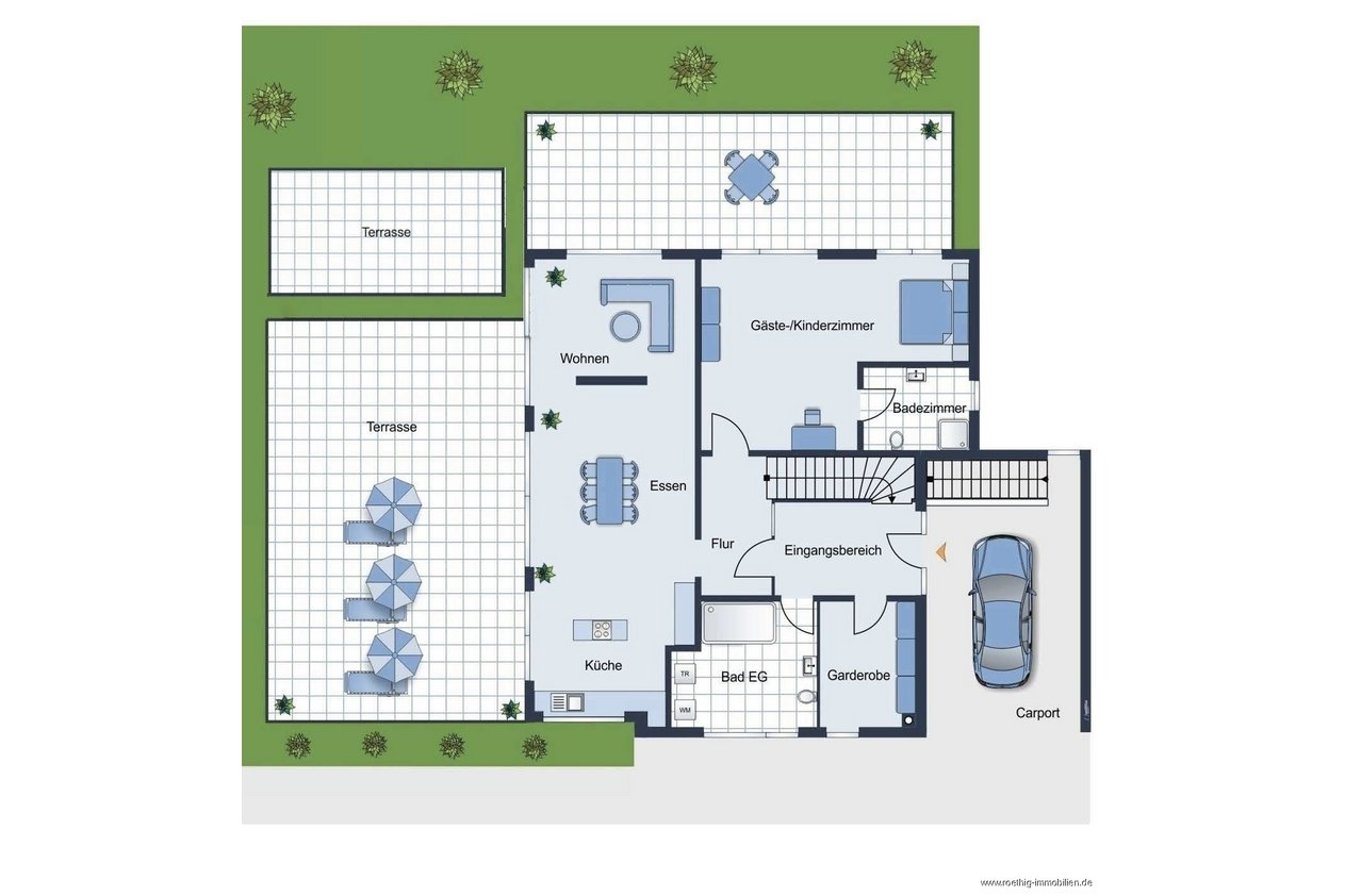 Der repräsentative Einfahrtsbereich mit überdachtem, unterkellerten Carport ist eingebettet in eine parkähnliche Gartenanlage mit hochwertigem Lichtkonzept für eindrucksvolle Abendstimmung.