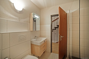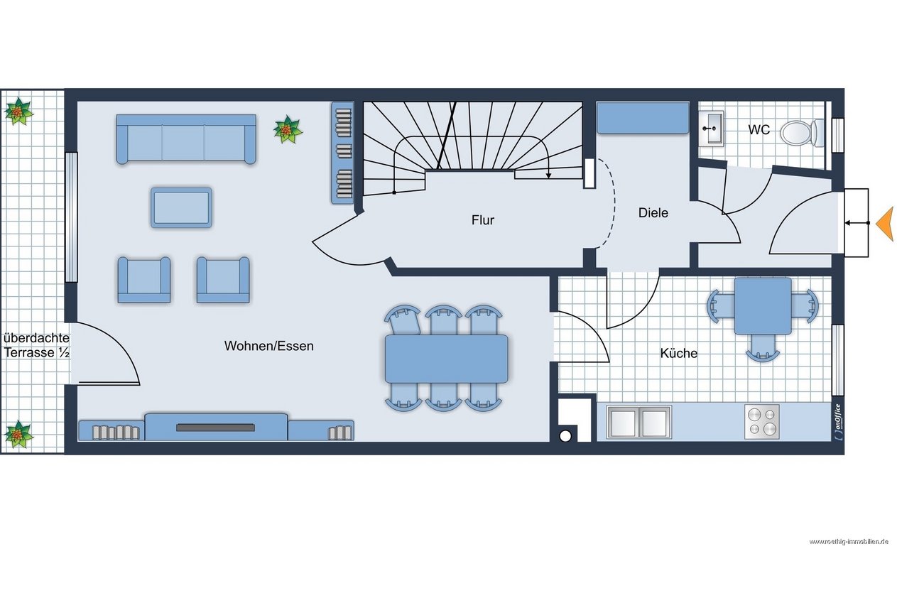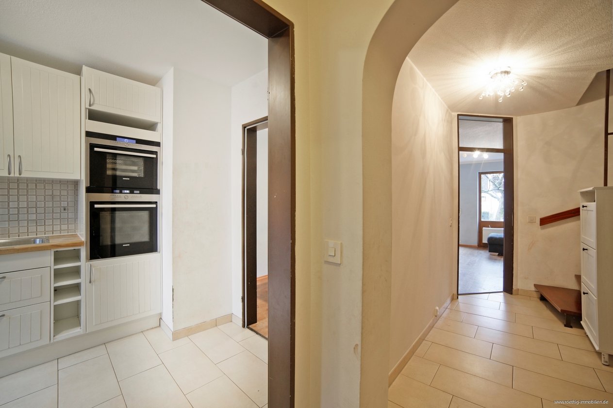 Die mit Fließen ausgelegte Diele präsentiert sich hell und gepflegt. Hier gibt es ein Gäste-WC. Im Flur ist reichlich Platz für eine Garderobe. Im Erdgeschoß befinden sich außerdem noch die Küche und das Wohnzimmer. Die Einbauküche ist voll ausgestattet und lässt mit einem großen Fenster reichlich Tageslicht einströmen. Das geräumige Wohn- und Esszimmer ist dank der großen Fenster hell und bietet Zugang zum Garten.