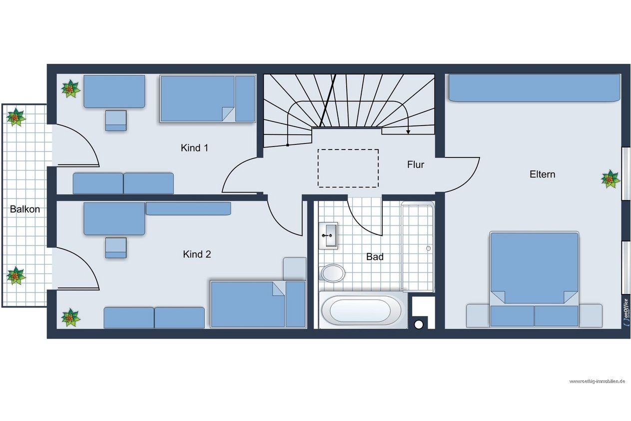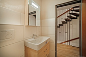 In der ersten Etage befinden sich drei Schlafzimmer. Der Boden ist aus Eichenparkett. Das moderne Bad auf der ersten Etage bietet eine Badewanne sowie eine separate Dusche. Das Elternzimmer ist mit zwei großen Fenstern nach Osten zur Morgensonne ausgerichtet. Die beiden Kinderzimmer haben Zugang zum Balkon und bieten, durch die Westausrichtung, Sonne bis in die Abendstunden. Das Dachgeschoß wurde zu einem Studio ausgebaut und präsentiert sich großzügig und hell. Mit den bereits vorhandenen Küchenanschlüssen kann es auch als Einliegerwohnung oder Elternbereich genutzt werden. Des Weiteren verfügt das Dachgeschoß über ein Bad mit Dusche.