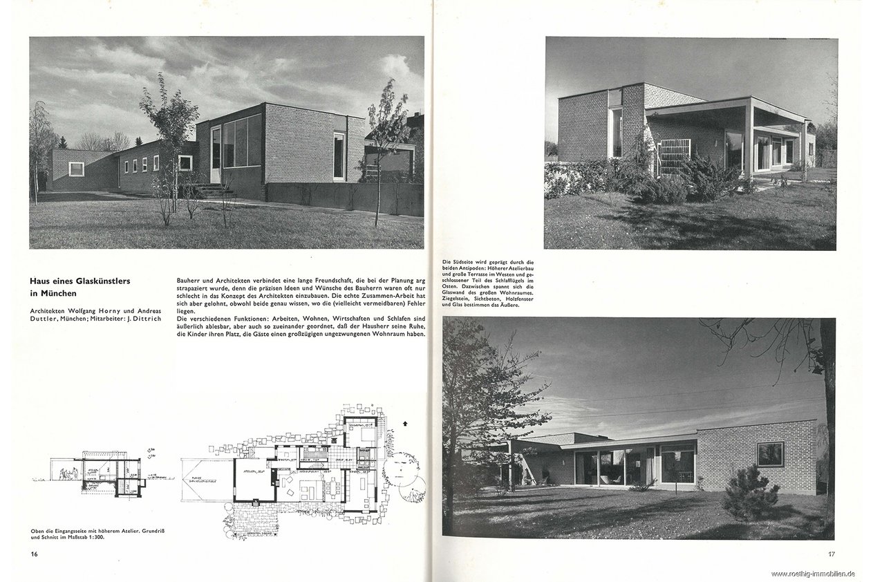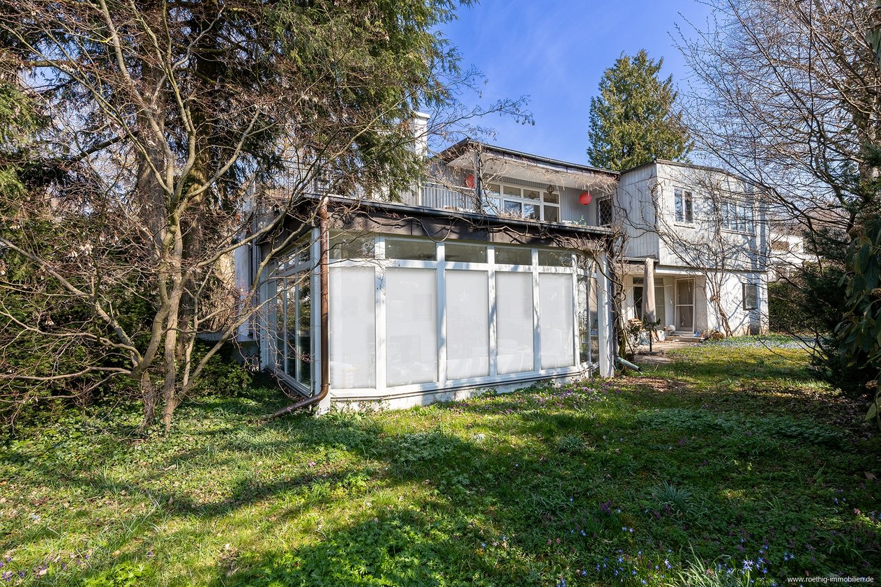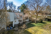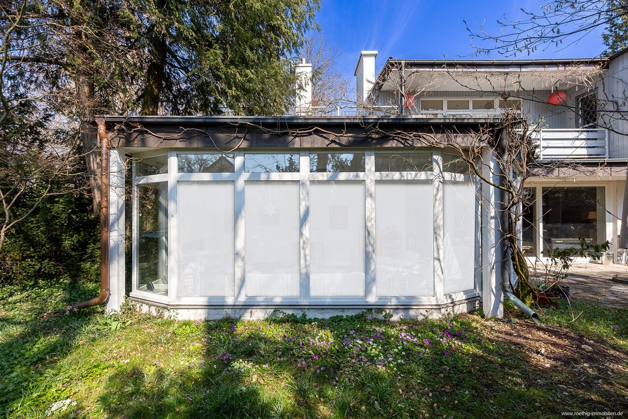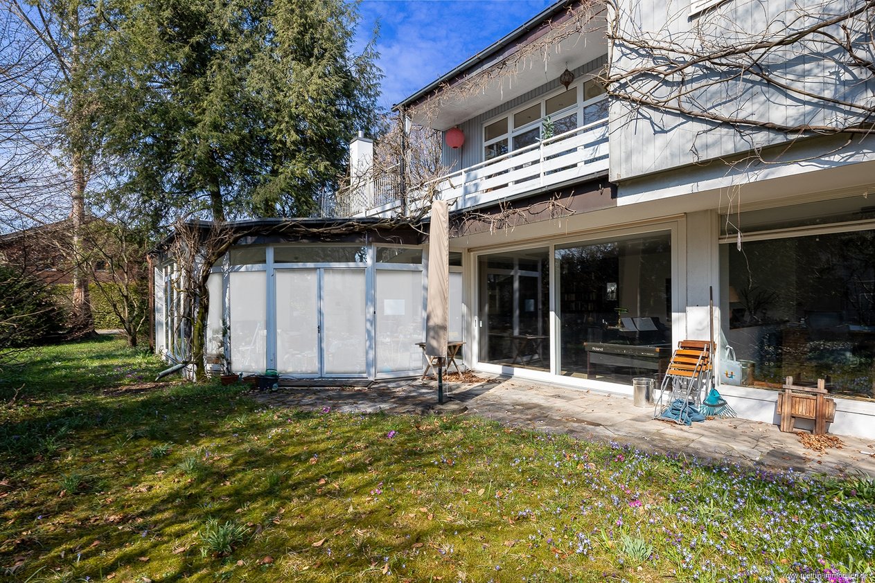 Wichtig: Es haben in der Vergangenheit keine relevanten Sanierungsmaßnahmen stattgefunden. Daher bietet es die Möglichkeit, mit viel Liebe zum Detail saniert zu werden, um seinen Charakter zu bewahren. Das ursprüngliche Gebäude wurde von den Münchner Architekten Wolfgang Horny und Andreas Duttler entworfen, die insbesondere die Architektenszene der Nachkriegszeit Münchens geprägt haben. Durch das für zu diese Zeit moderne, bauhaustypische und funktional fokussierte Design des Hauses, das hauptsächlich auf eine möglichst große Gartennutzung des weitläufigen Grundstücks ausgerichtet war, tauchte dieses Haus in Architektenmagazinen und Fachbüchern auf. Durch Aufstockungen in den frühen 1960er- und 1990er-Jahren sowie einen Wintergartenanbau im Erdgeschoss entstand über die Jahre das Gebäude im Ist-Zustand: ein Erdgeschoss mit etwa 223 m² Wohn-/Nutzfläche und ein Obergeschoss mit ca. 197 m² Wohn- & Nutzfläche zzgl. eines Kellergeschosses. Derzeit befinden sich im Haus zwei eigenständige Wohneinheiten (EG & OG), welche über zwei separate Eingänge zu erreichen sind. Die Grundrisse ermöglichen aber gleichermaßen eine Nutzung als großzügiges Einfamilienhaus.