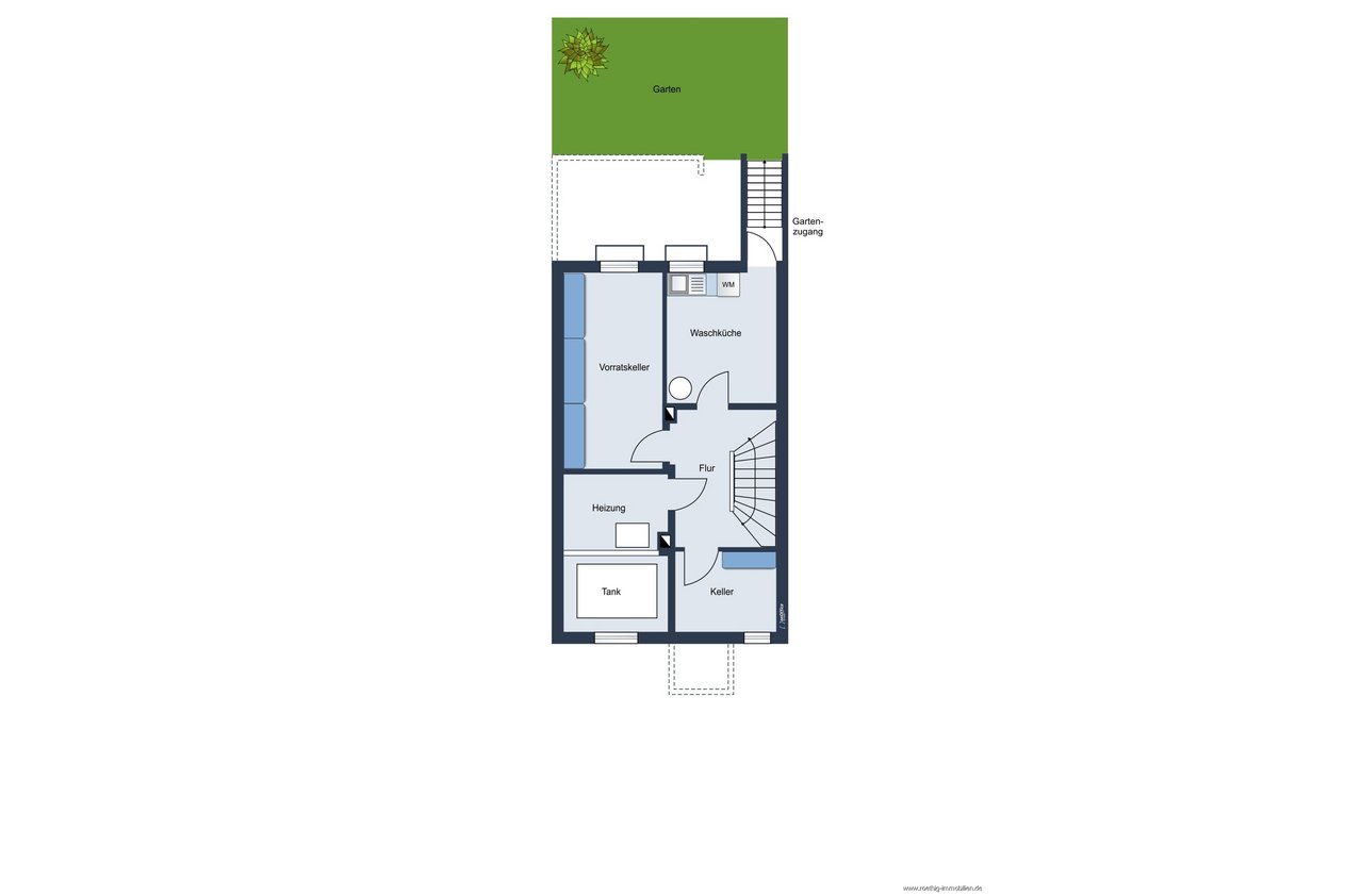Das Untergeschoss überzeugt mit einem praktischen Hauswirtschaftsraum mit direktem Gartenzugang und einem großzügigen Vorratsraum, der vielfältigen Stauraum- und Nutzungsmöglichkeiten eröffnet.