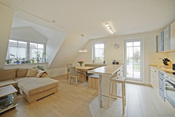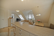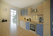 Es gibt ein großzügiges Wohn- und Esszimmer mit offener Einbauküche und Tresen, über das Sie links Zugang zur Terrasse und rechts über die Küche Zugang zum Nord-West-Balkon haben. Die Terrasse ist zum Nachbarhaus und der Balkon zur Straße ausgerichtet. Dieses geräumige Wohn- und Esszimmer mit offener Einbauküche und Tresen ist das zweitgrößte Zimmer dieser Wohnung, ist dank der vielen Fenster lichtdurchflutet und bietet eine gute Möglichkeit Kochen und Kommunikation mit Gästen oder Familie zu vereinen.