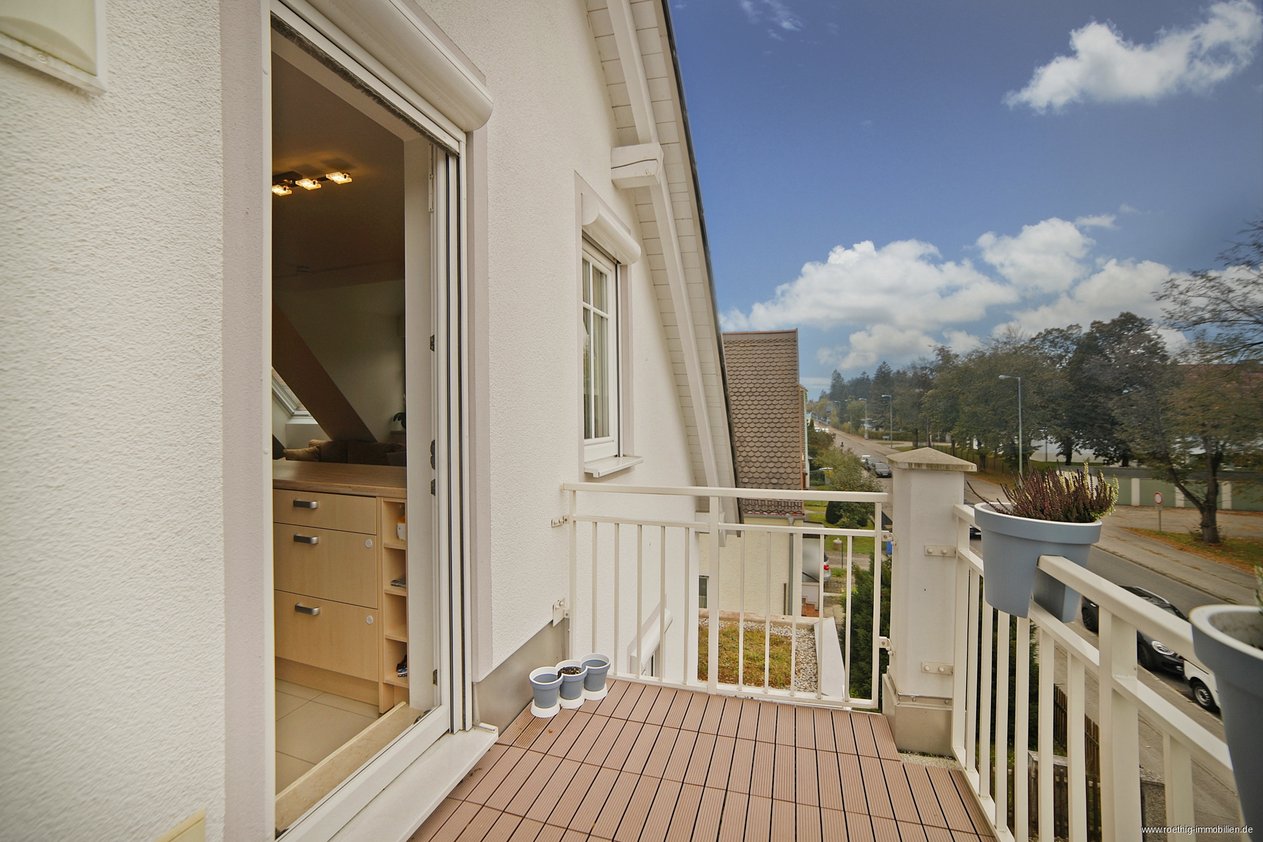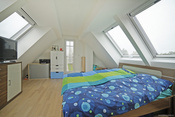 Die Wohnung befindet sich im Dachgeschoss in einem neuwertigen, gepflegten Mehrfamilienhaus. Über den Flur erreichen Sie alle Zimmer der Wohnung und über eine Treppe nach oben noch einen Hobbyraum, der als Elternschlafzimmer genutzt werden kann. Direkt auf der linken Seite neben der Eingangstüre befindet sich eine Nische unter der Treppe, die zusätzlichen Stauraum bietet.