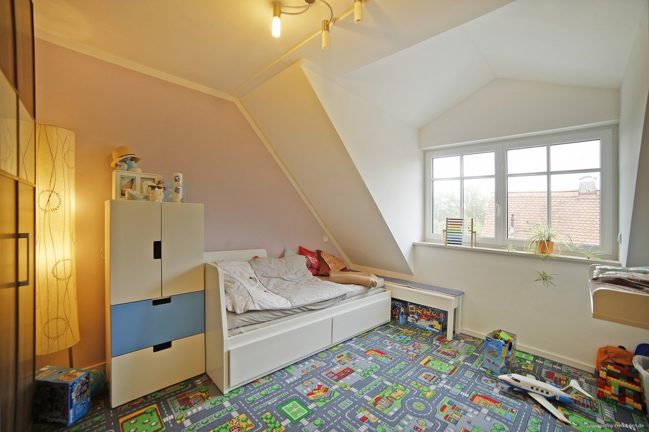 Über die Treppe gelangen Sie in die obere Etage, in der sich noch ein weiterer Raum befindet, der als Hobbyraum deklariert ist und als Elternschlafzimmer genutzt wird. Dieses Zimmer ist schön hell, bietet Stauraum und durch die Schrägen Gemütlichkeit.