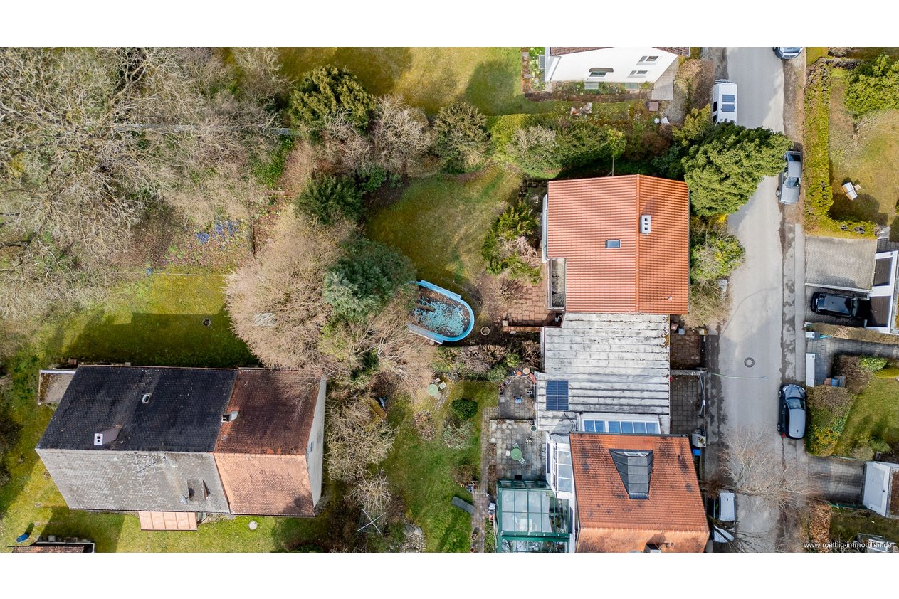 Das blickgeschützte Grundstück am südlichen Teil der Parkstadt Solln zwischen Wald & Wiesen bietet durch den einrahmenden Baum- & Pflanzenbestand ein Höchstmaß an Privatsphäre & umfasst ca. 659 m². Der Hauseingang & die Garage befindet sich auf der Nordseite, weshalb der wundervolle Garten samt Pool, Terrasse & Balkon wiederum nach Süden wie auch Westen & Osten ausgerichtet ist.