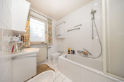 Als helles Familienbad konzipiert, vereint das Tageslichtbad mit zusätzlicher Badewanne & Bidet ein stimmigen Gesamtbild mit angenehmer Belichtung & freundlicher Raumwirkung.