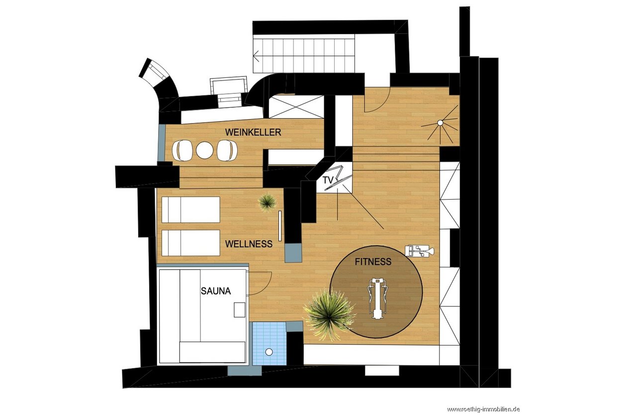 Gegenwärtig ist das Erdgeschoss mit dem Untergeschoss innerhalb der Wohnung mit einer Wendeltreppe verbunden. Im Untergeschoss stehen Ihnen weitere ca. 63 m² Nutzfläche zur Verfügung. Ihrer Kreativität sind hier fast keine Grenzen gesetzt. Unser Innenarchitekt hätte einen Wellness- und Fitnessraum vorgeschlagen, so wie auf dem Plan ersichtlich. Das Untergeschoss ist ebenfalls durch einen direkten Zugang über den begrünten Innenhof zugänglich.