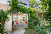 Über den liebevoll bepflanzten Vorgarten mit praktischem Fahrradhäuschen und einem stilvoll angelegten Wasserbecken mit Seerosen gelangen Sie in Ihr neues Zuhause.