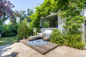 Der große, liebevoll angelegte Garten windet sich malerisch um das gesamte Haus und schafft mit seinen geschickt gestalteten Bereichen mehrere Plätze zum Entspannen. Die Terrasse ist mit hochwertigem Naturstein gestaltet. Rechterhand, in sonniger Südausrichtung, lädt ein zweiter, mit Holz verkleideter Terrassenabschnitt zum Verweilen ein.