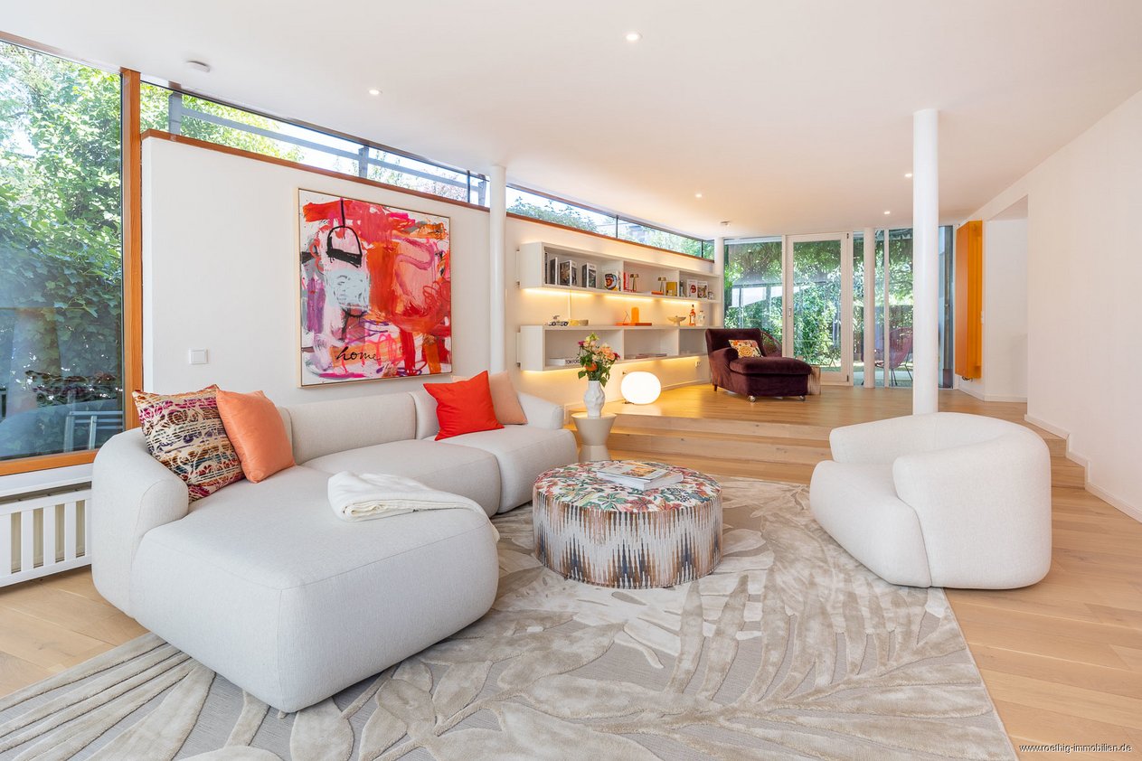 Inmitten eines liebevoll angelegten Gartens präsentiert sich dieses lichtdurchflutete Architektenhaus aus dem Jahr 1968 mit einem stilvollen Anbau aus dem Jahr 1999. Auf mehreren Ebenen in einem eleganten Splitlevelkonzept und ca. 344 m² Wohnfläche mit einer Deckenhöhe von bis zu über 4 m eröffnet sich eine einzigartige Wohnwelt mit eleganten Schiebetüren, einer zusätzliche Terrasse über dem grünen Garten sowie vielfältigen Rückzugsbereichen, die Platz für jedes Familienmitglied bieten.