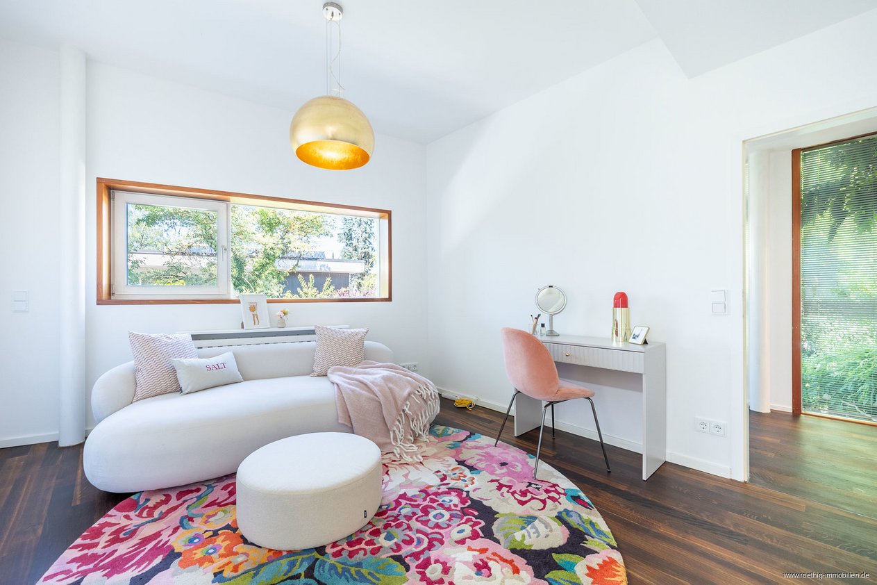 Im Obergeschoss empfängt Sie eine offene Galerieebene mit edlem, dunklem Parkett. Diese Empore eignet sich ideal als ruhiger Arbeitsbereich und schafft durch einen französischen Balkon mit herrlichem, grünen Blick über den eigenen Garten eine perfekte Arbeitsatmosphäre.