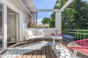 Am Ende des Flurs befindet sich der vierte Schlafbereich mit ca. 10 m², der ebenfalls direkten Zutritt auf die schöne Terrasse ermöglicht. Hier genießen Sie einen unvergleichlichen grünen Ausblick und genießen alle Vorzüge eines privaten Außenbereichs direkt vor dem Schlafzimmer. Diese ca. 9 m² große, sonnige Terrasse in Südwest-Ausrichtung begeistert mit viel Platz für Pflanzen und einem atemberaubenden Blick auf den eigenen Garten.
