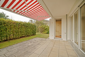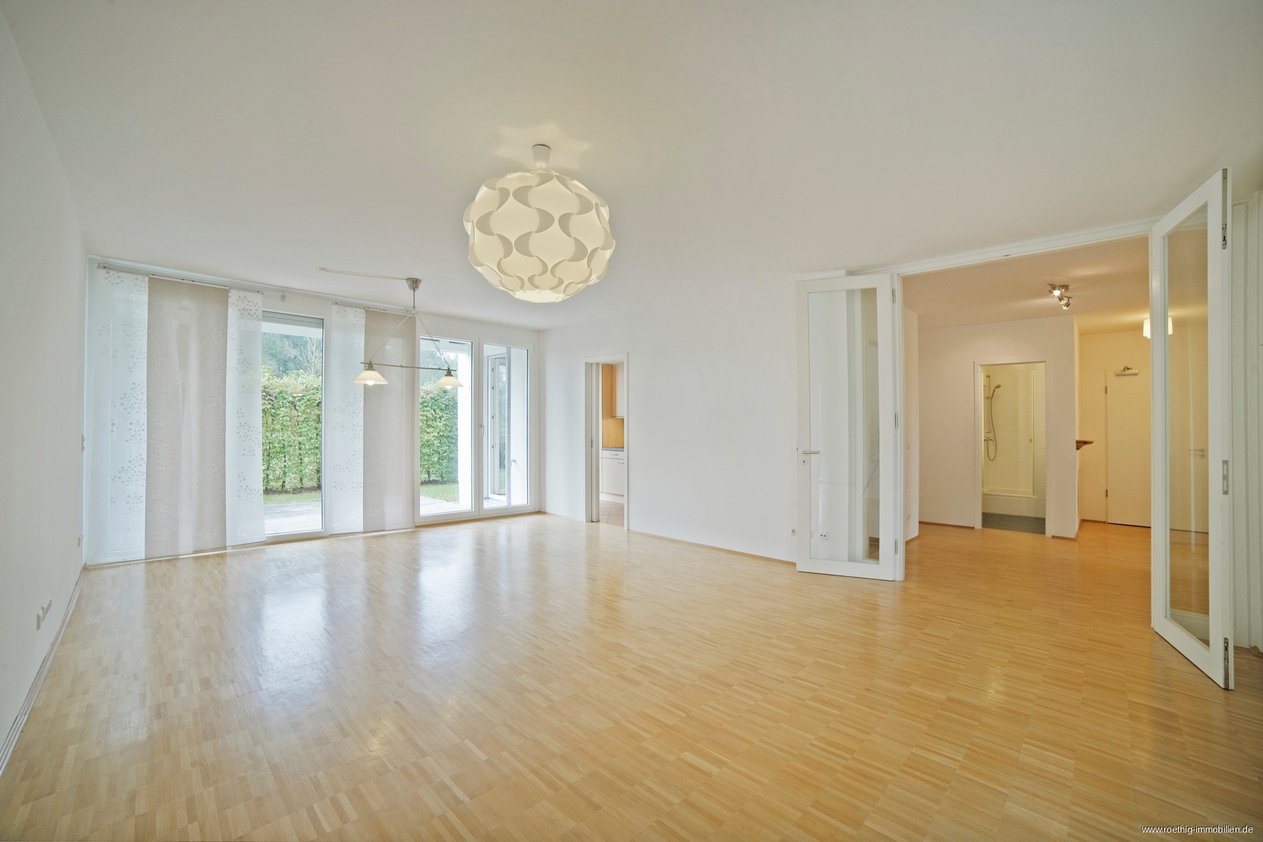 Vom Eingangsbereich führt eine angrenzende Flügeltür, die viel Licht in die Wohnung bringt, direkt in das Schmuckstück der Wohnung: das große, helle Wohnzimmer. Aufgrund seiner Größe und des durchdachten Schnitts lässt es sich individuell gestalten. Auch ein großzügiger Wohn- und Essbereich findet hier problemlos Platz. Vom Wohnzimmer aus ermöglichen große Flügeltüren den Zugang in den eigenen Garten. Der umlaufende, gepflegte Garten mit Rasenfläche sowie die sonnige Terrasse bieten viel Raum zur Erholung und für gesellige Stunden im Freien. Ein weiteres Schlafzimmer grenzt direkt an den Wohnbereich an.