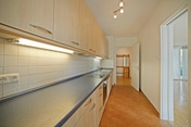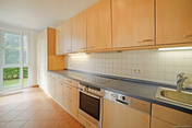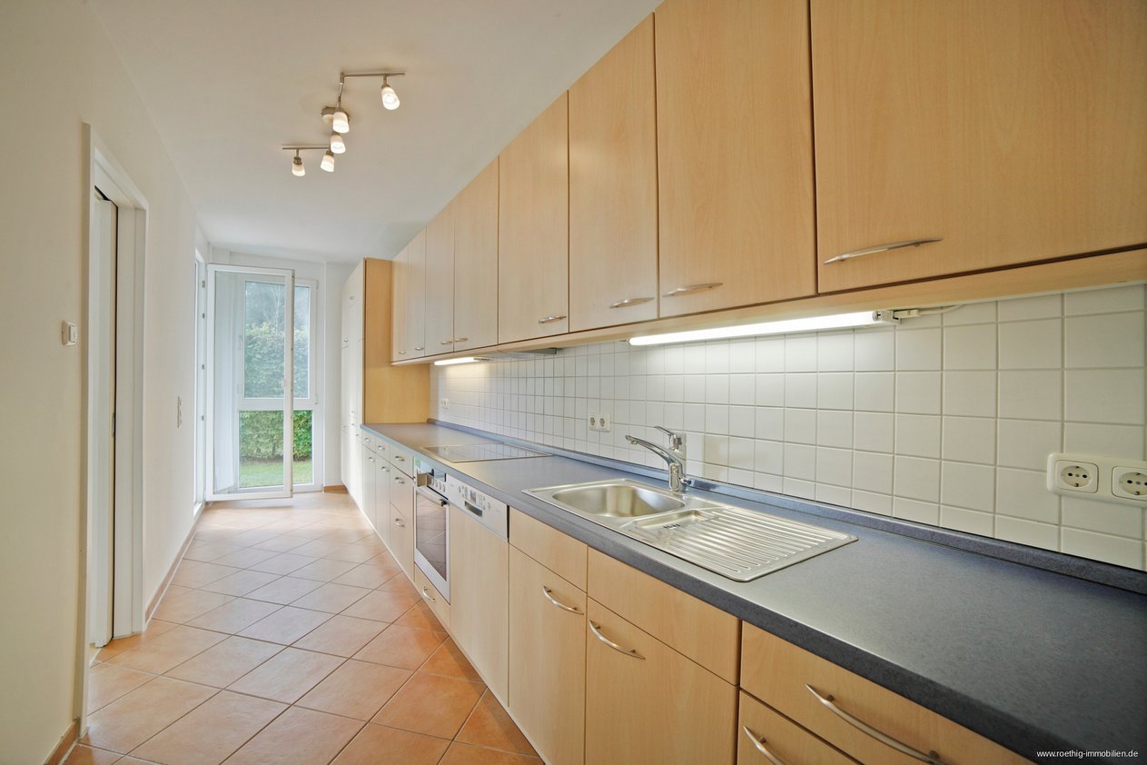 Die Küche lässt sich von zwei Seiten betreten und bietet dadurch eine besonders praktische Raumstruktur. Die klassische und zeitlose Einbauküche lässt keine Wünsche offen. Große bodentiefe Fenster sorgen auch hier für viel Tageslicht.