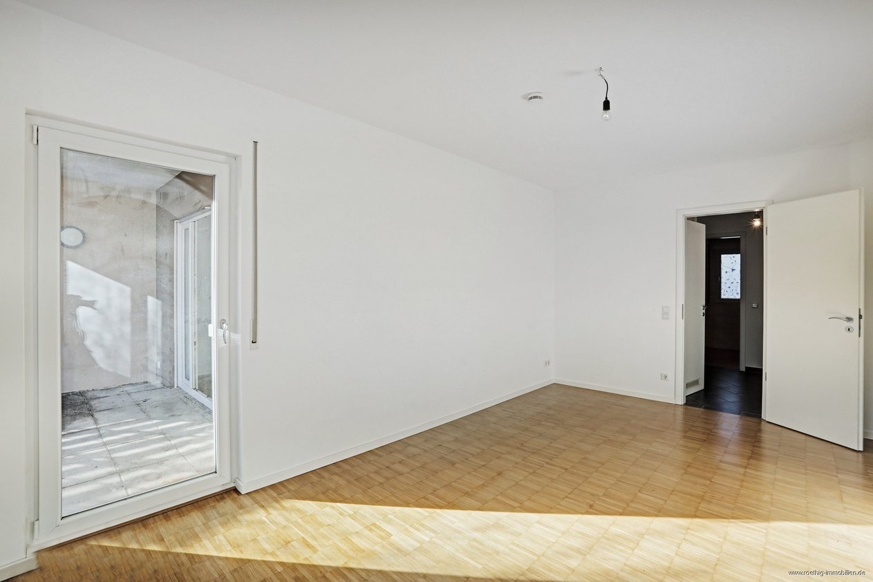 Linker Hand vom Flur liegt das großzügige Schlafzimmer. Der Boden (wie in allen Wohnräumen) ist mit einem hochwertigem Stäbchenparkett versehen. Durch ein bodentiefes Fenster mit Zugang zur Terrasse präsentiert es sich äußerst hell und freundlich. Bei Bedarf kann der Raum durch Rollläden abgedunkelt werden. Genügend Platz für ein großes Bett sowie für einen Kleiderschrank ist problemlos vorhanden.
