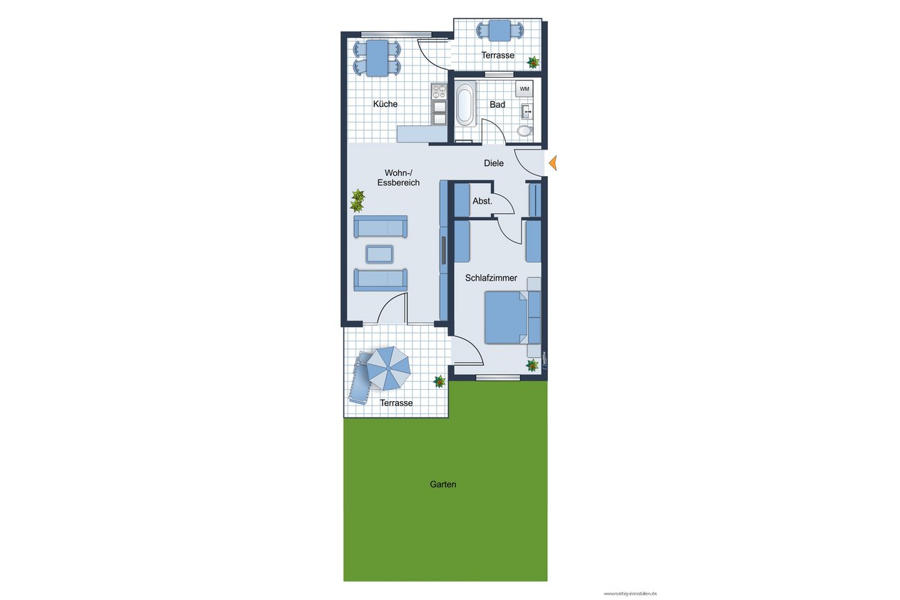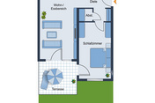 Folgen Sie dem Flur gerade aus, kommen Sie in das Herzstück der Wohnung - dem weitläufigen Wohn-/Essbereich. Dieser präsentiert sich durch den idealen rechteckigen Schnitt überaus großzügig. Eine Sofalounge sowie ein Essbereich können problemlos integriert werden. Bodentiefe Fenster lassen viel Licht in den Raum und gewähren zeitgleich Zutritt zum Highlight der Wohnung - der Terrasse mit Privatgarten.