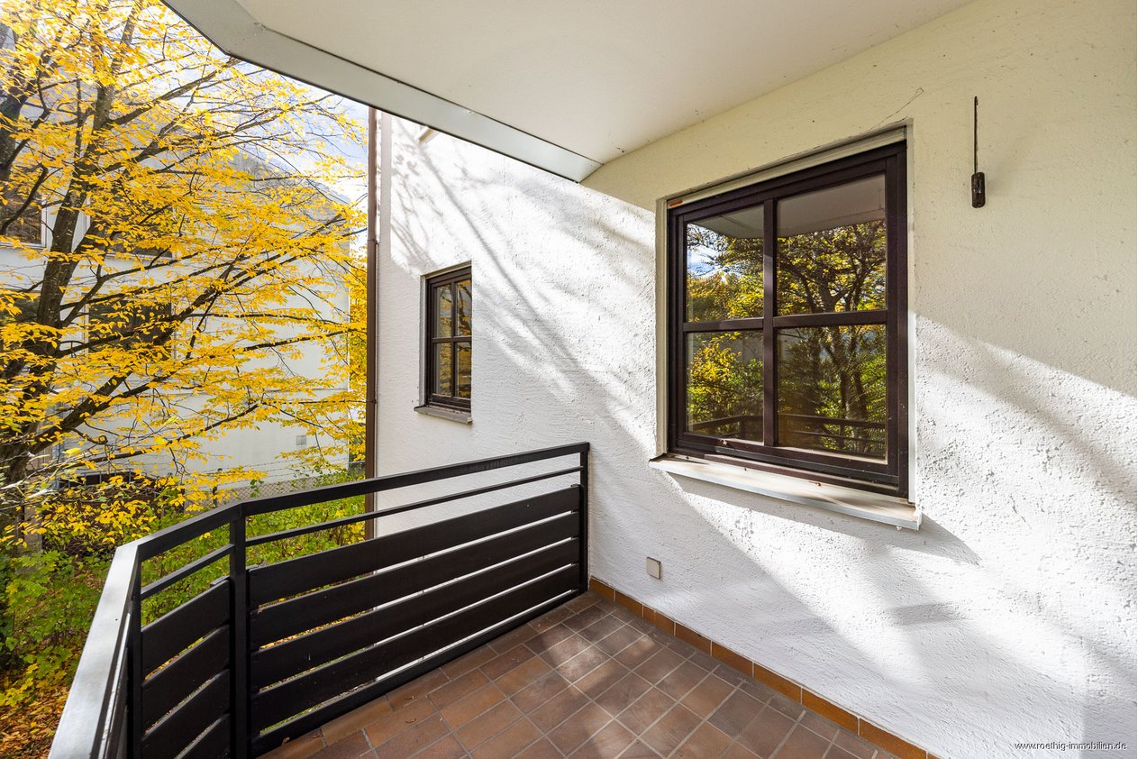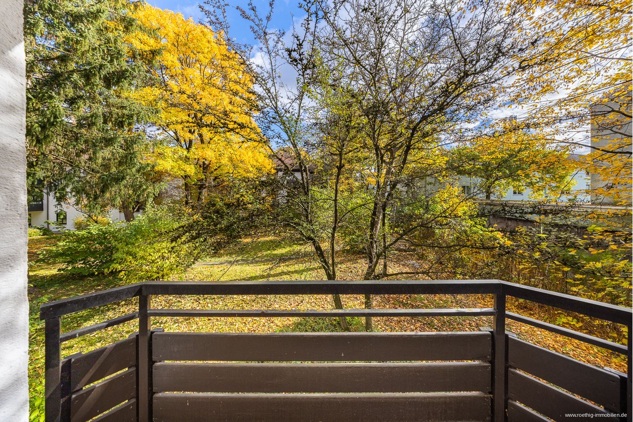 Der überdachte Balkon ist ein echtes Refugium der Ruhe – ideal zum Innenhof ausgerichtet und mit einem malerischen Blick auf das satte Grün und den alten Baumbestand. Dank seiner geschützten Lage ist er windgeschützt und verfügt zudem über einen praktischen Stromanschluss – perfekt, um ihn auch an kühleren oder regnerischen Tagen gemütlich zu nutzen.