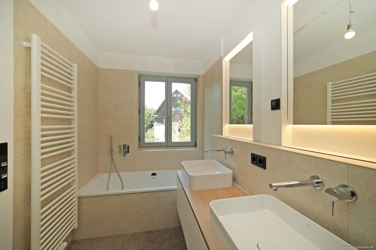 Das moderne Bad en suite ist nur vom Schlafzimmer aus zugänglich und eines der Highlights der Wohnung. Ein großes Fenster macht es zu einem Tageslichtbadezimmer und es ist mit einem Doppelwaschbecken, einem Handtuchheizkörper, hochwertigen Fliesen, einer Regendusche mit Glaswand und zusätzlich einer Badewanne ausgestattet. Alles in allem ein Badezimmer, welches keine Wünsche offen lässt.