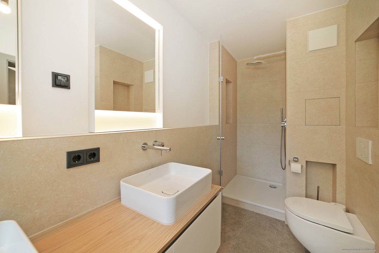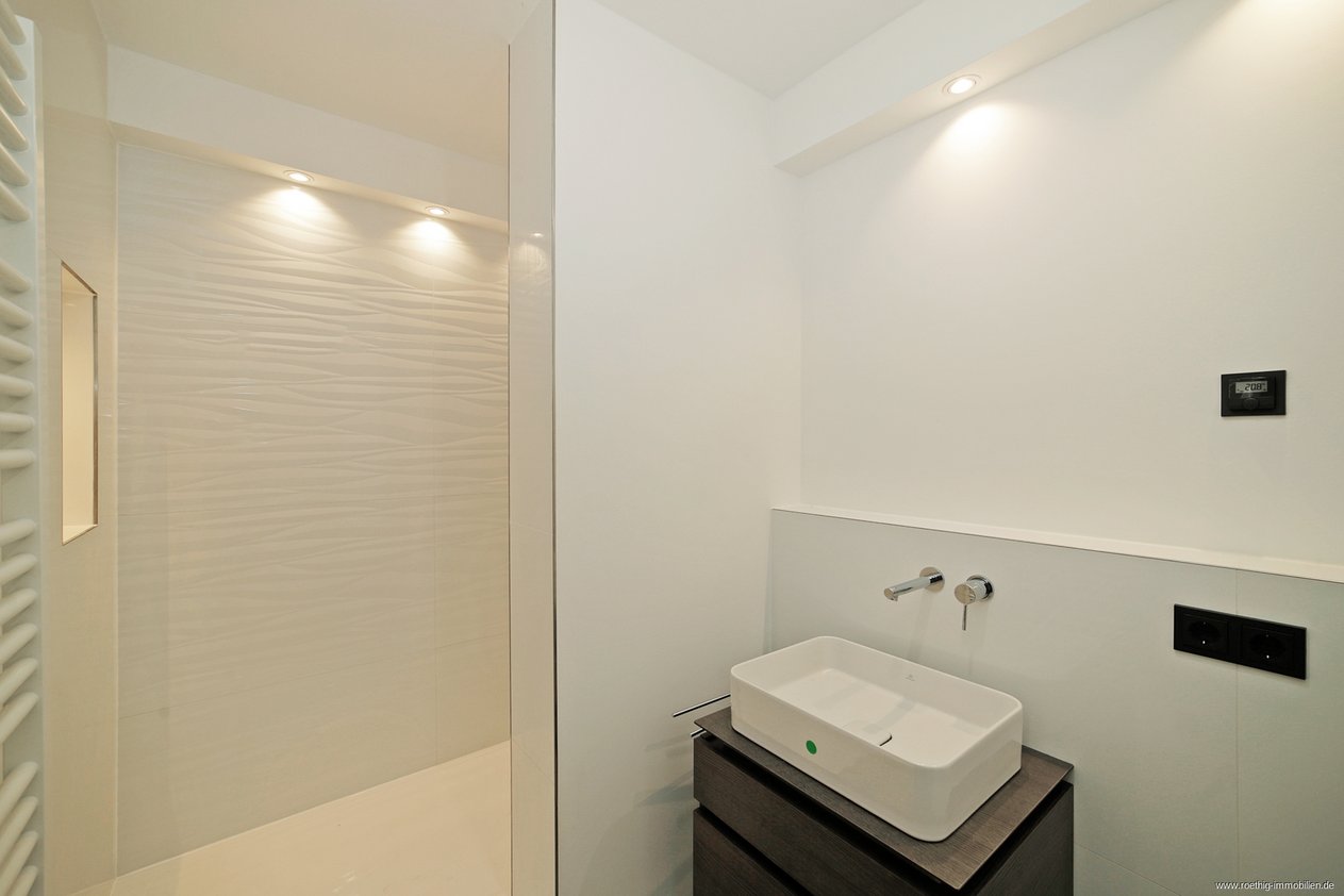 Gegenüberliegend liegt das moderne Gästebad, versehen mit einer weiteren Toilette, einem Handtuchheizkörper und einem Waschmaschinenanschluss. Besonders hervorzuheben ist die Regendusche, welche sich in einer großzügigen Nische befindet.
