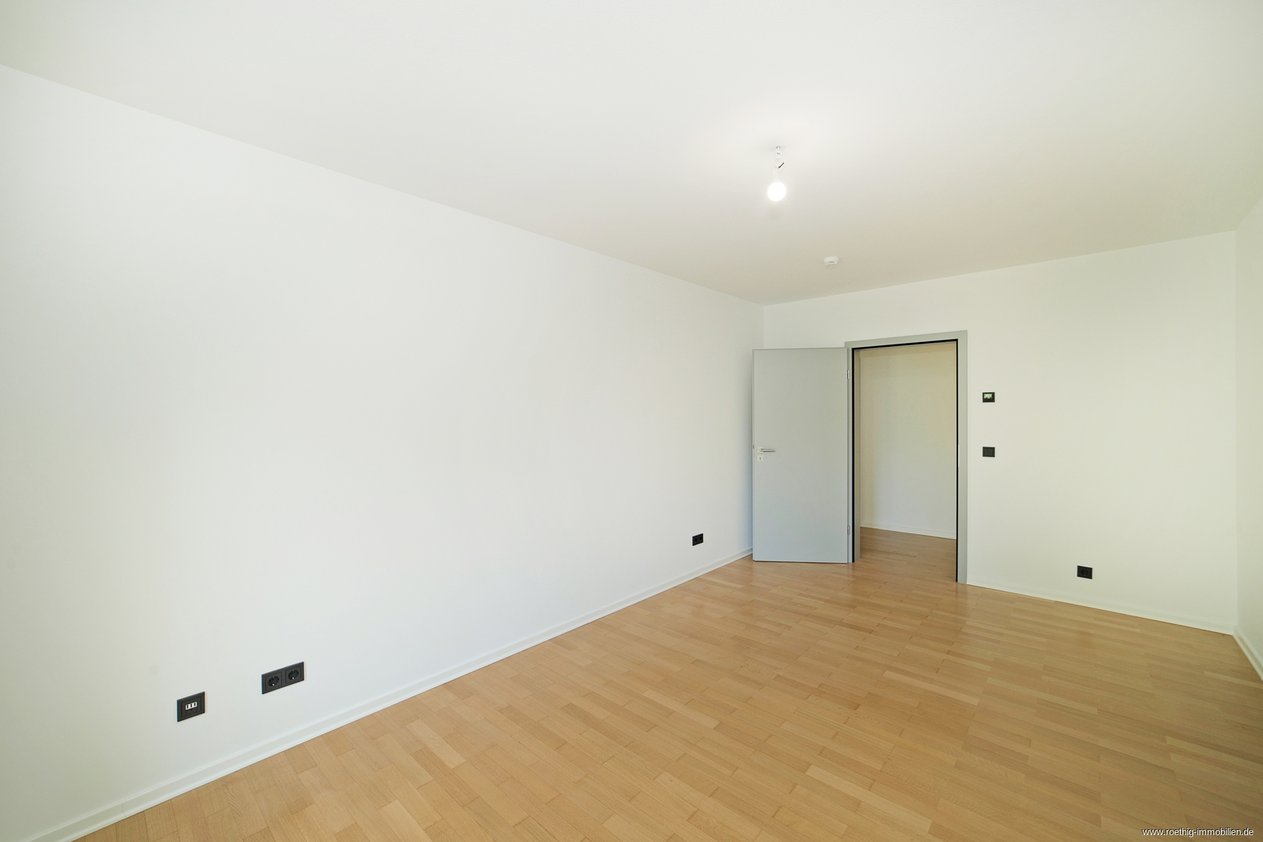 Linker Hand des Flurs befindet sich das gemütliche, ruhig gelegene Schlafzimmer mit mehreren bodentiefen Fenstern und ausreichend Platz für Ihre individuelle Einrichtung. Zugang zu einem der Balkone mit Blick ins Grüne ist von hier gegeben.