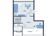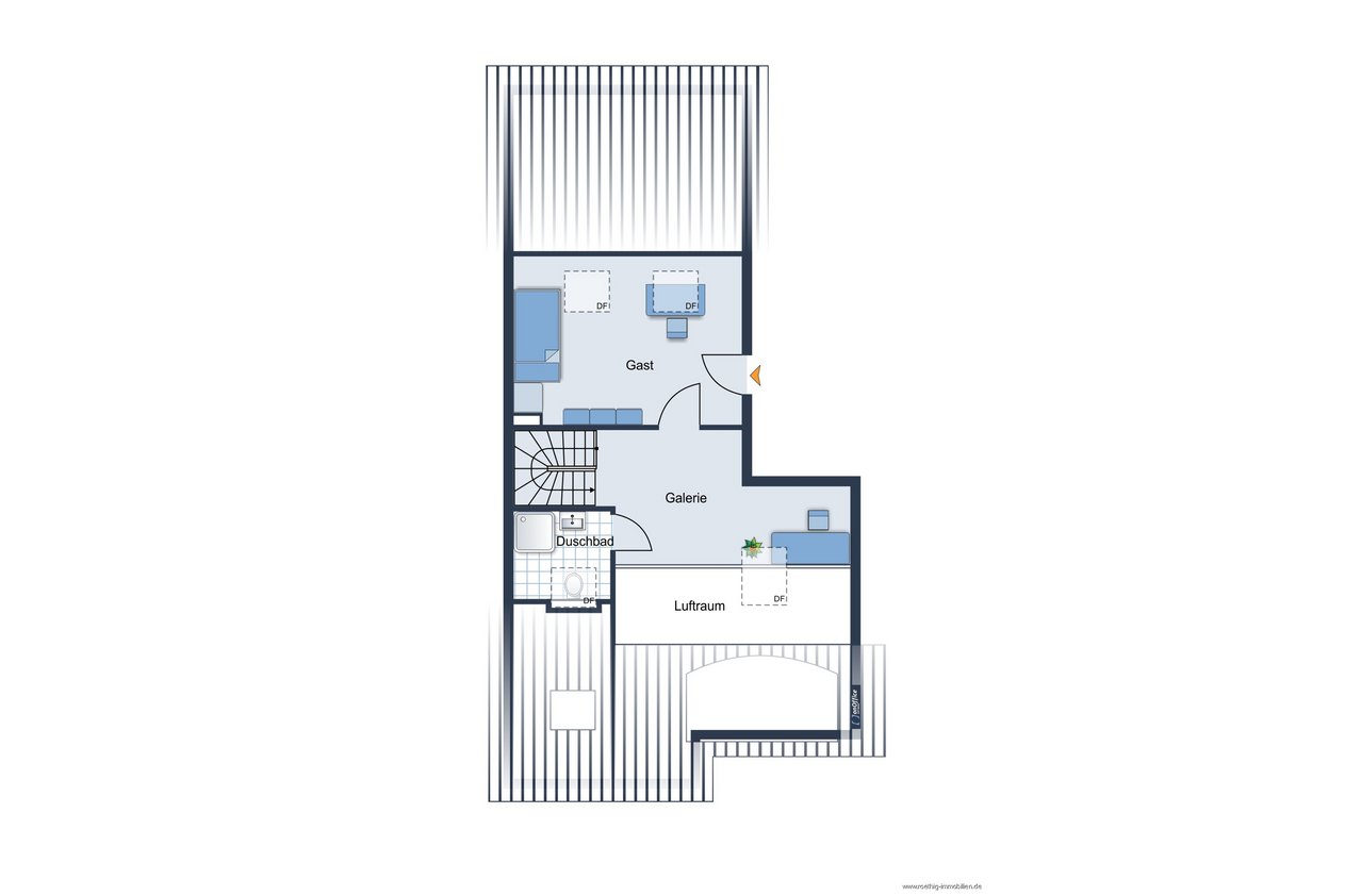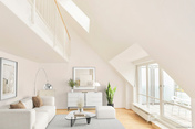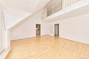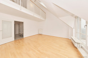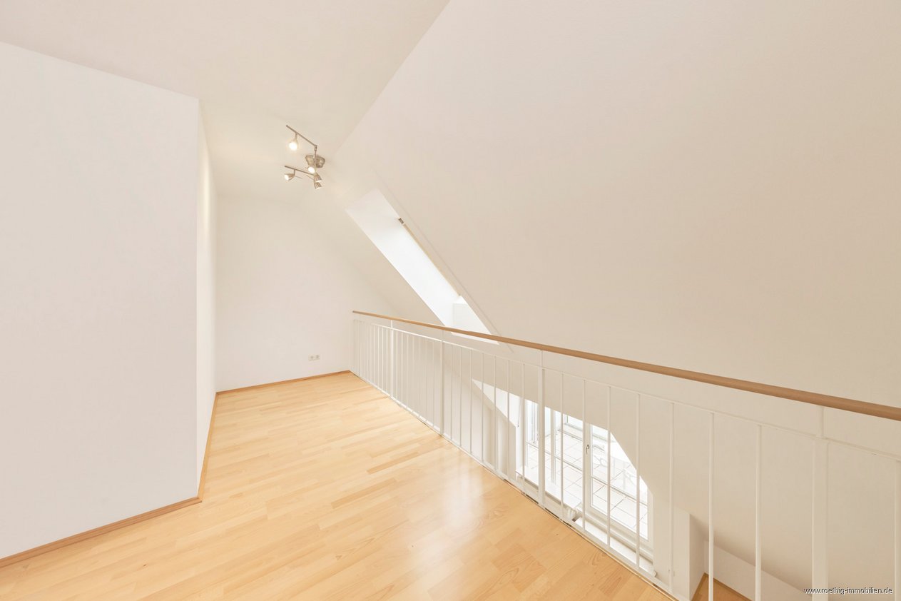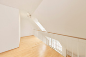 Eine elegante Holzwendeltreppe verbindet beide Ebenen der Wohnung auf leichte, natürliche Weise. Sie führt hinauf zu einer offenen Galerie, die dank großzügiger Dachfenster von Licht durchflutet ist. Sie bietet vielfältige Nutzungsmöglichkeiten - sei es als Arbeitsplatz, Leseecke oder persönlicher Rückzugsort.