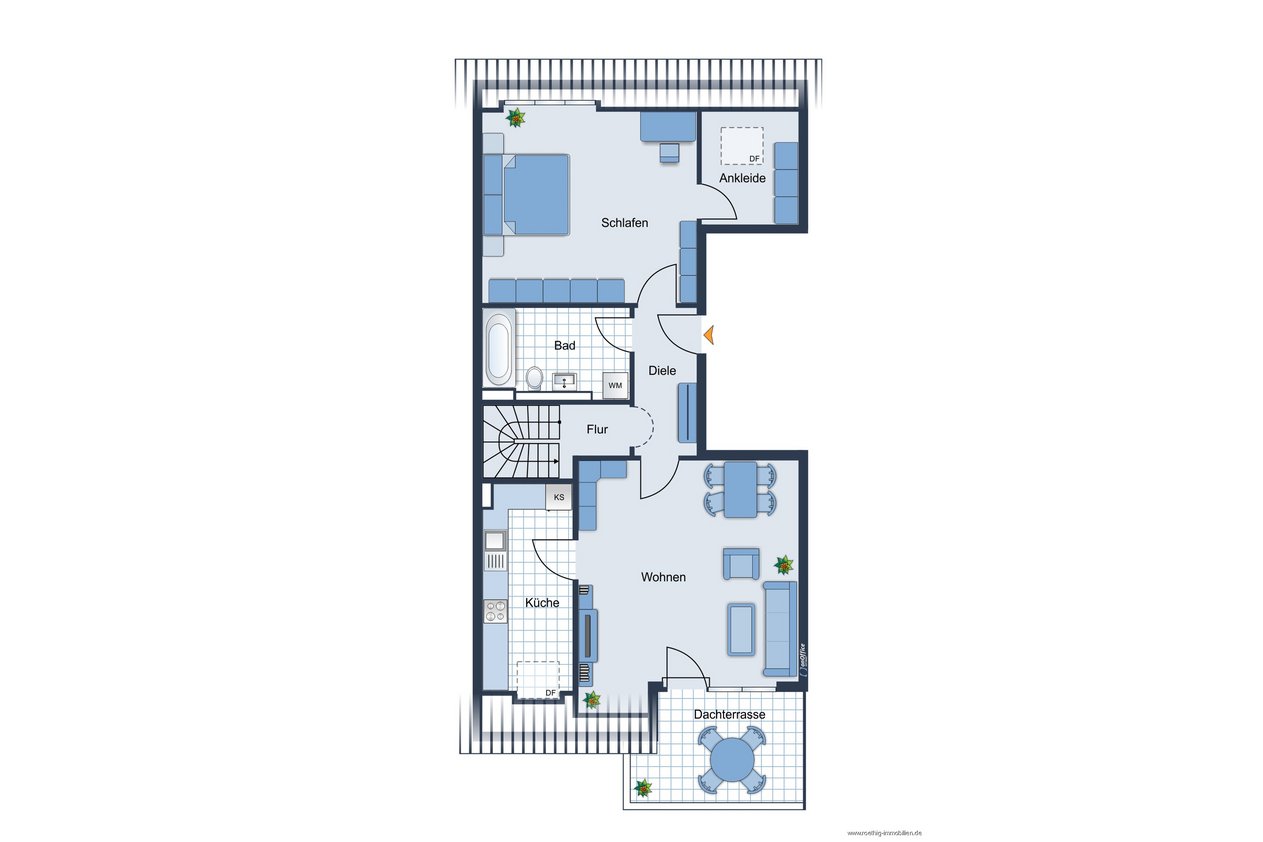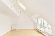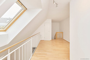 Die rund 97 m² große Maisonettewohnung überzeugt durch einen durchdachten Grundriss, großzügige Raumhöhen bis zu ca. 5,20 m und ein stimmiges Wohngefühl. Schon beim Betreten spürt man die angenehme Offenheit und Helligkeit, die sich durch alle Bereiche zieht. Der Eingangsbereich, welcher Platz für eine Garderobe bietet, geht harmonisch in die weiteren Räume über und schafft so eine natürliche Trennung. Das Schlafzimmer mit großzügigen Dachfenstern und elektrischen Rollläden eröffnet durch den gut durchdachten Grundriss vielfältige Einrichtungsmöglichkeiten. Besonders praktisch ist die angrenzende separate Ankleide, welche dem Schlafzimmer durch das Verstauen der Kleidung noch mehr Platz zur individuellen Gestaltung bietet.