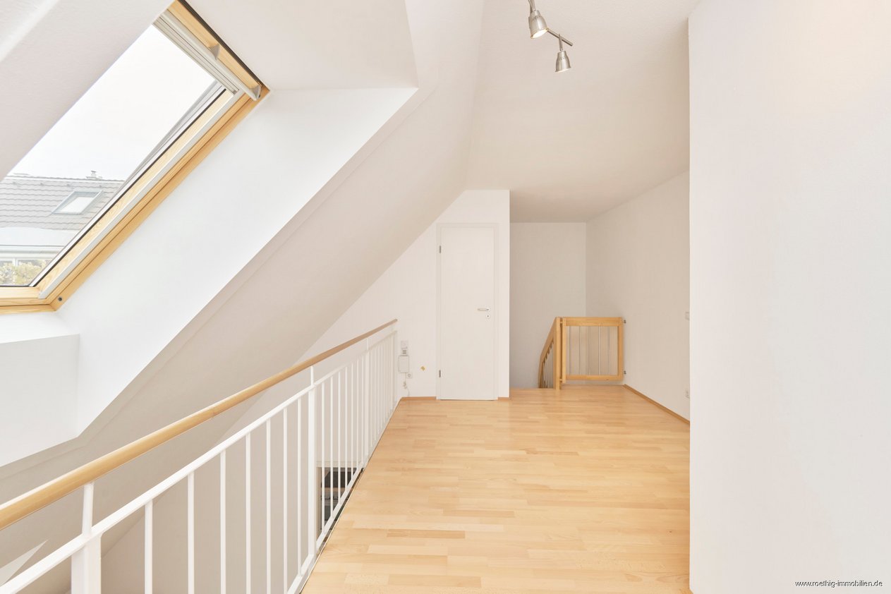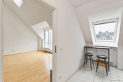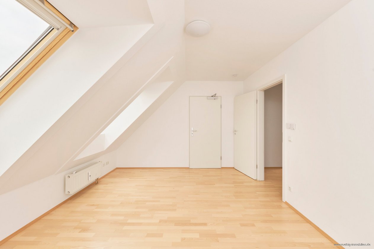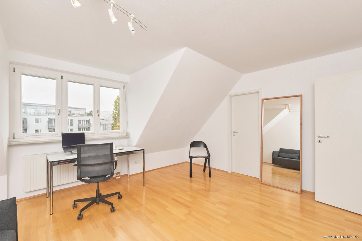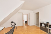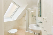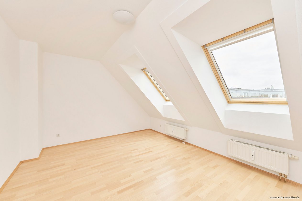 Das zusätzliche Zimmer im Obergeschoss bietet mit seinem perfekten Grundriss vielfältige, interessante Nutzungsmöglichkeiten, sei es als Kinder-, Gäste- oder Arbeitszimmer und ist ebenfalls mit zwei großen Dachfenstern in Richtung des ruhigen Innenhofes sowie elektrischen Rollläden ausgestattet. Ergänzt wird die obere Ebene durch ein optimal proportioniertes Tageslichtbadezimmer mit einer Dusche, einem WC und einem Waschbecken.