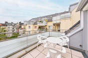 Der Wohn- und Essbereich bildet das Herzstück der Wohnung. Der sonnenverwöhnte Raum besticht mit einer Raumhöhe von bis zu 5,20 m, bietet viel Platz für Ihr persönliches Interieur und lädt zu geselligen Stunden mit Familie und Freunden ein. Großzügige bodentiefe Fensterflächen lassen viel Tageslicht herein und schaffen eine warme, offene Atmosphäre. Über eine bodentiefe Fenstertür gelangen Sie auf die ruhige Dachterrasse. Hier lässt sich der Blick in den sehr ruhigen und grünen Innenhof genießen, während die Markise an heißen Tagen für angenehmen Schatten sorgt und der Außenbereich zum erweiterten Wohnraum wird.