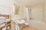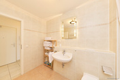 Direkt daneben und über den zentralen Flur zugänglich befindet sich das großzügige Hauptbadezimmer in einem sehr gepflegten Zustand. Das zeitlos geflieste Badezimmer lässt keine Ausstattungswünsche offen und ist mit einer Badewanne, einem Waschbecken, einem Handtuchheizkörper sowie einem Waschmaschinenanschluss eingerichtet - eine funktionale Kombination aus Komfort und Alltagstauglichkeit.