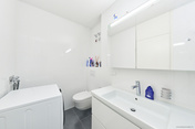 Gegenüber präsentiert sich das moderne, mit ansprechenden schwarzen Boden- und weißen Wandfliesen versehene Badezimmer. Geschmackvolle Armaturen, eine elegante und große bodentiefe Regendusche mit Glaswand sowie eine Fußbodenheizung sorgen für absoluten Komfort. Eine Lüftung und ein Waschmaschinenanschluss sind ebenfalls vorhanden.
