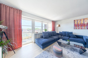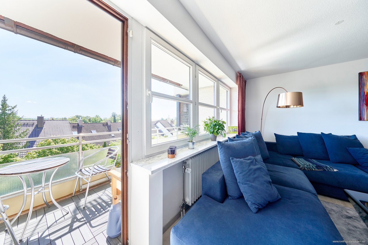 Den Lebensmittelpunkt der Wohnung bildet das lichtdurchflutete Wohn- und Esszimmer. Ein Schrank, Sideboards und ein großes Sofa gehören zur Ausstattung. Die Möblierung ist farblich optimal aufeinander abgestimmt und der zusätzliche Blick aus dem Fenster direkt ins Grüne lädt zum geselligen Beisammensein ein. Dank der bodentiefen Fensterfronten im Wohnzimmer erhält man Zugang zum Highlight der Wohnung – dem nach Süden ausgerichteten Balkon, auf welchem Sie tagsüber die Sonne genießen und abends den Tag mit unverbautem Blick auf die Alpen entspannt ausklingen lassen können.