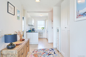 Nach Betreten der Wohnungseingangstür befindet man sich im zentralen und geräumigen Flur, welcher alle Räumlichkeiten zugänglich macht. Der helle Boden versprüht bereits im Eingangsbereich ein wohliges Ambiente. Genügend Platz für eine Garderobe ist im Flur vorhanden und ein eleganter Schuhschrank ist passend platziert.