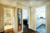 Beim Betreten der Wohnung stehen Sie im zentralen Flur, von dem alle Räume abgehen. Auf dem Weg zum Bad befindet sich auf der linken Seite eine kleine Nische, welche sich sehr gut für eine Garderobe anbietet. Das Bad überzeugt durch seine hochwertige Ausstattung. Es wurde moderne Großfließen verwendet und verfügt über eine tolle Dusche, einen riesigen Spiegel, welcher noch genügend Abstellfläche bietet. Zusätzlich befindet sich im Bad ein Waschmaschinenanschluss.