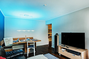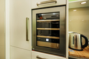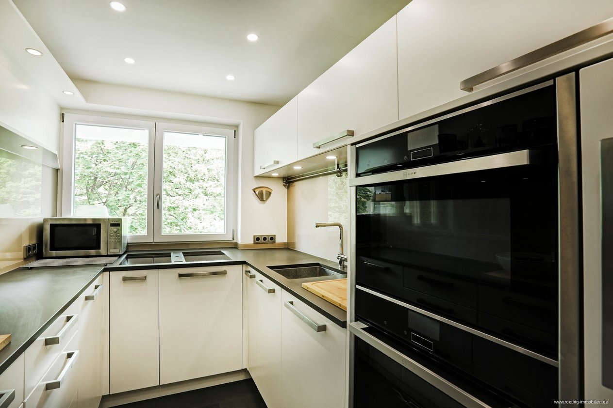 Das Wohnzimmer ist durch die großen Fenster hell und freundlich. Mit seinen ca. 20 m² Wohnfläche bietet es neben einer gemütlichen Sofaecke auch noch genügend Platz für einen Essplatz. Die Küche der Wohnung ist ein weiteres Highlight. Sie verfügt über eine voll ausgestattete vom Schreiner angefertigte Einbauküche mit exklusiven Geräten wie zum Beispiel einem Dampfgarer, einem Weinkühler und einer Wasseraufbereitungsanlage.