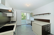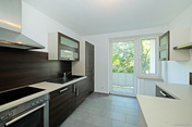 Angrenzend liegt die separate Küche, die über eine Einbauküche mit allen technischen Geräten verfügt. Ein Herd, eine Spülmaschine, ein Kühlschrank mit Gefrierfach sowie ein Ofen stehen Ihnen zur Verfügung. Zusätzlich ist viel Stauraum vorhanden. Von hier aus haben Sie auch direkten Zugang zum gemütlichen Balkon, welcher ausreichend Platz für einen Tisch mit Sitzgelegenheiten bietet – der ideale Ort für entspannte Stunden im Freien mit Familie und Freunden.