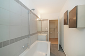 Das großzügige Badezimmer ist mit einer Badewanne, einem Waschtisch sowie einem WC ausgestattet. Ein großes Fenster macht es zu einem Tageslichtbad und sorgt zeitgleich für die optimale Belüftung.