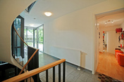 Alle Räume sind über die zentrale Diele zu erreichen. Wohn- und Schlafbereiche sind mit hellem Buchenholzparkett ausgestattet, das Souterrain mit einem hellgrauen Teppichboden. Alle Fenster sind mit Außenrollos versehen. Die Rollos im Wohn- und Esszimmer sind elektrisch. Das Kinderzimmer/Gäste- oder Arbeitszimmer ist gut geschnitten und ebenfalls ruhig gelegen. Das geräumige Wohn- und Schlafzimmer haben durch bodentiefe Fenster Zugang zu Terrasse und Garten und öffnen somit das Raumgefühl nach außen.
