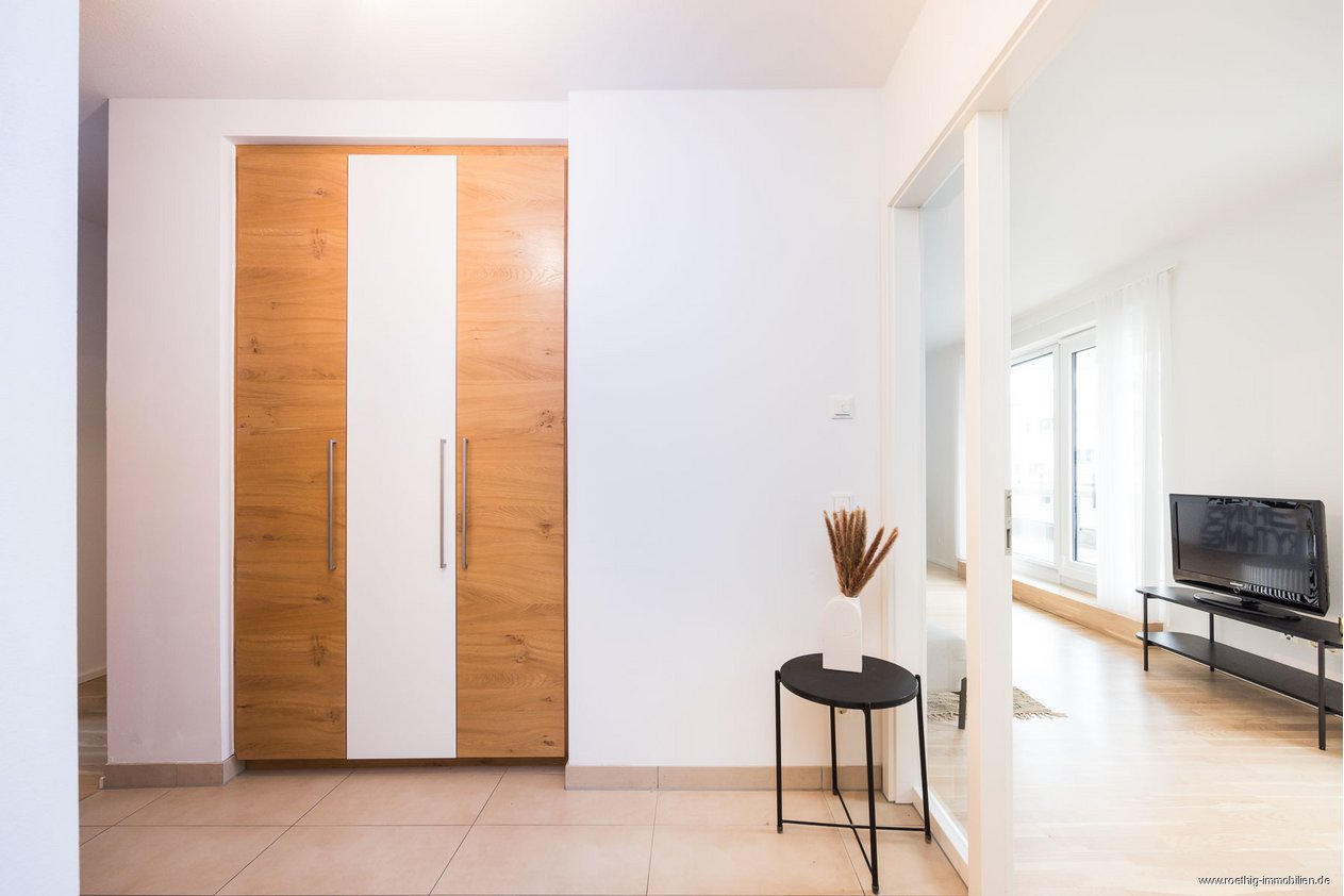 Betreten Sie die Wohnung, befinden Sie sich direkt im einladenden Eingangsbereich, welcher viel Platz für eine Garderobe und beispielsweise ein Sideboard bietet. Zwei maßgefertigte Einbauschränke stehen Ihnen für zusätzlichen Stauraum zur Verfügung. Bereits hier spüren Sie das einzigartige Raumgefühl, das durch die großzügige Raumhöhe von etwa 2,60 m entsteht.