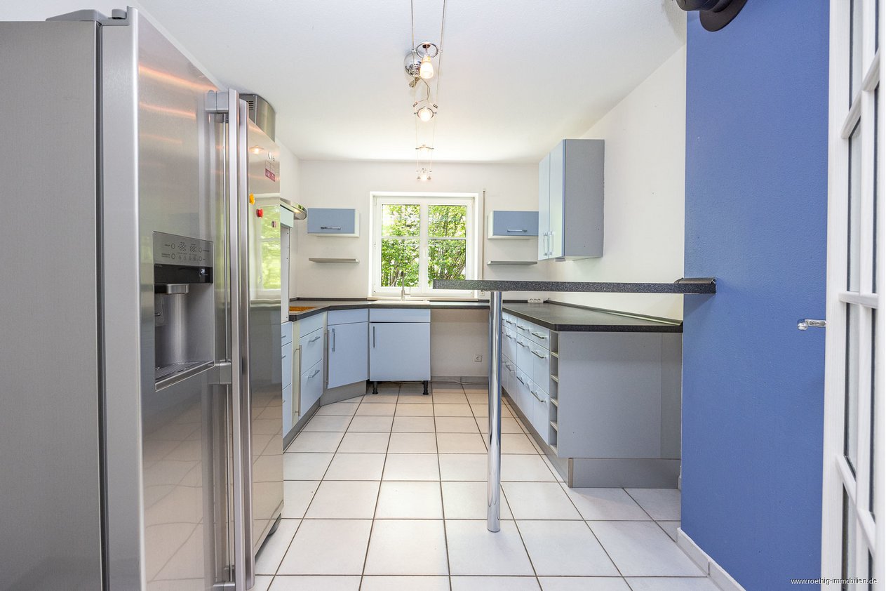Angrenzend an das Schlafzimmer und über den gemeinsamen Balkon verbunden präsentiert sich ein weiteres Schlaf-, Arbeits- oder Gästezimmer. Gegenüber der Eingangstüre befindet sich die äußerst helle Küche. Ein großes Fenster mit Blick in den Garten lässt viel Licht in diesen Raum. Vollständig ausgestattet und mit viel Stauraum lässt die Küche keine Wünsche offen. Das repräsentative Herzstück der Wohnung liegt rechts der Eingangstür: ein herrschaftliches Wohnzimmer mit einer Deckenhöhe von über 6 Metern. Durch eine deckenhohe Fensterfront ist dieser Raum besonders hell und lichtdurchflutet. Ein Highlight dieses Wohnzimmers ist der große Kachelofen.