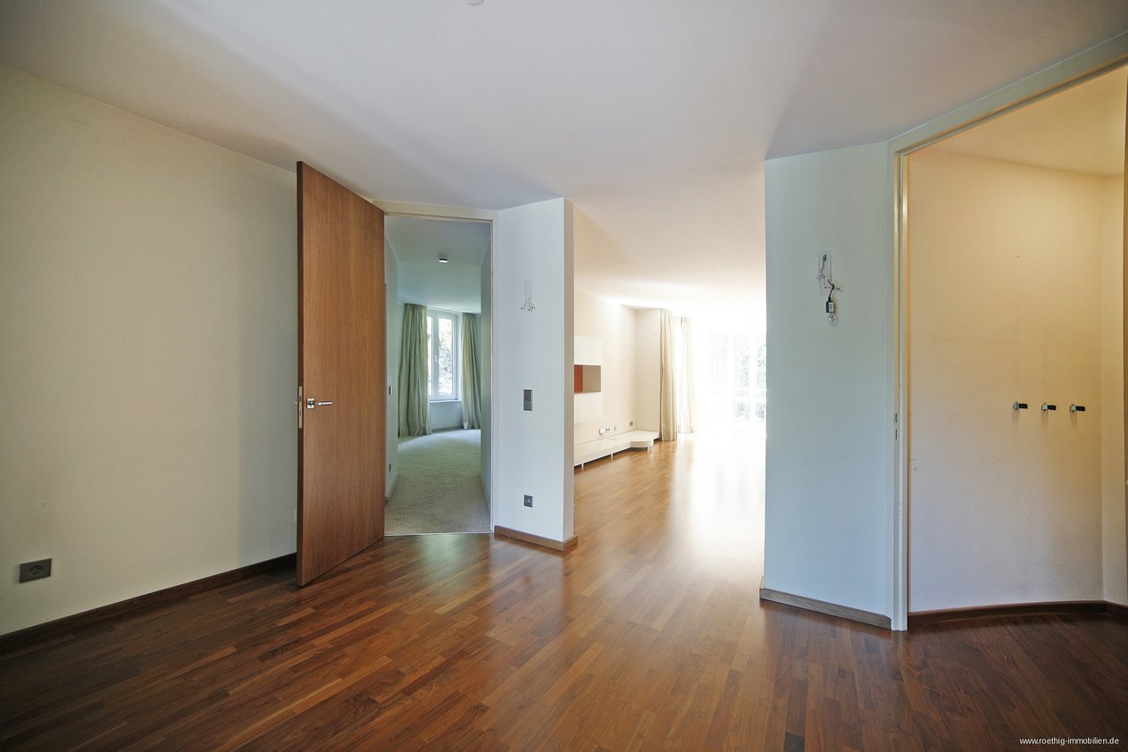 Nur selten kommt eine solche Gelegenheit auf den Münchner Immobilienmarkt. Direkt am englischen Garten, in der Nähe des Chinesischen Turms und des Seehauses gelegen, erwartet Sie diese schöne Wohnung im ersten Obergeschoß eines eleganten Mehrfamilienhauses auf einem Parkgrundstück. Die Wohnung ist absolut ruhig rückwärtig gelegen mit herrlichen Ausblicken ins Grüne. Bodentiefe Fenster, hohe Räume, Toppausstattung und eine elegante Aufteilung geben der Wohnung ein besonderes Flair. Über einen Vorraum der viel Platz für Stauraum bietet betreten Sie die Wohnung und gelangen in die zentrale Diele von der aus man alle weiteren Räume erreichen kann. Die Küche ist mit einer Einbauküche ausgestattet. Das danebenliegende Esszimmer ist hell und großzügig und zur Diele hin offen, so dass man aucheine Verbindung zum großzügigen Wohnzimmer hat.Desweiteren verfügt die Wohnung über zwei Schlafzimmer, ein luxuriöses Bad, ein Gäste WC, sowie eine Abstellkammer. Vom Wohnzimmer aus hat man Zugang zu der ca. 16 qm großen Terrasse, die uneinsehbar ist.