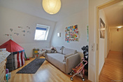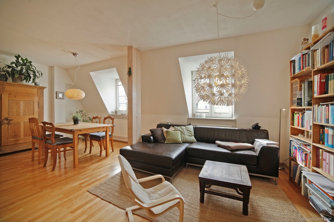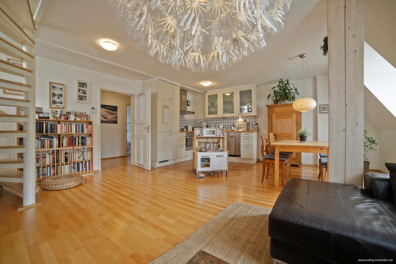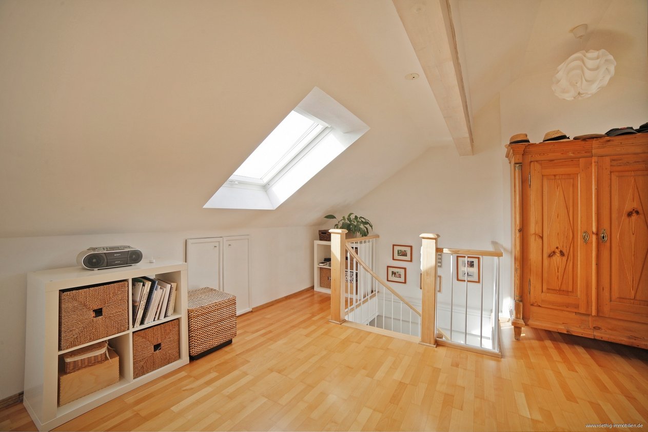 Von hier aus gelangt man zu einem weiteren Raum der durch Schnitt und Helligkeit Ateliercharakter hat und sich hervorragend als Schlafbereich eignet. Auch bietet sich noch Raum für einen Arbeitsbereich. Viel Platz und Stauraum in den Abseiten für Ihre Utensilien finden Sie hier ebenfalls. Die Dachfenster können mit Jalousien verschattet werden, so dass zu jeder Jahreszeit ein angenehmes Raumklima herrscht und auch Langschläfer nicht von der Helligkeit dieser schönen Wohnung zu früh geweckt werden. Die Fotos geben einen guten Eindruck von der Behaglichkeit der Räume. Auch haben Sie einen wunderbaren Blick über Sendling.