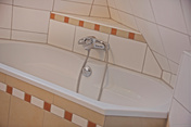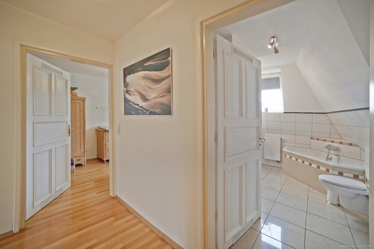 Sie betreten die Wohnung und gelangen in einen freundlichen Flur der mit Parkettboden ausgestattet ist. Hier befindet sich zunächst eine geräumige Abstellkammer die viel Stauraum bietet. Das danebenliegende, großzügige und elegante Badezimmer ist ebenfalls vom Flur aus erreichbar. Hier befindet sich neben einer separaten Dusche auch eine Eckbadewanne, WC und Waschtisch, sowie Platz für Waschmaschine und Trockner. Besonders zu erwähnen ist, dass das Bad ein großes Fenster hat, welches für Helligkeit und gute Lüftungsmöglichkeiten sorgt. Das nächste Zimmer bietet sich zur Nutzung als Kinder-, Gäste- oder Arbeitszimmer an.