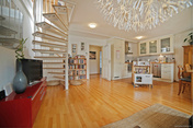 Ebenfalls vom Flur aus gelangt man in das Herzstück der Wohnung, den Wohn- /Essbereich mit offener Küche. Hier befindet sich auch die Einbauküche, Platz für einen schönen Essbereich und alles was Sie sonst zum Wohnen benötigen. Besonders gelungen ist auch die Verbindung zu dem oberen Raum, die mit einer Wendeltreppe geschaffen wurde. Diese wurde platzsparend im Eck platziert und in ansprechender zum Stil der Wohnung passender Optik errichtet.