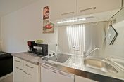 Die kleine Pantry-Küche im Eingangsbereich ist mit zwei Kochplatten, einen Kühlschrank sowie einer Mikrowelle ausgestatte. Auch bieten zusätzliche Schränke genügend Platz für den täglichen Küchenbedarf.