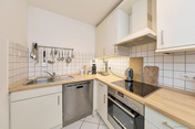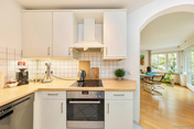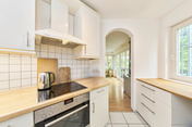 Die freundlich und hell gestaltete Küche ist vom Wohnbereich räumlich getrennt und mit einer modernen Einbauküche ausgestattet. Mit ihrem großzügigen Kochfeld, dem modernen Backofen und viel Stauraum in Schubladen und praktischen Oberschränken lässt diese Küche keine Wünsche offen. Ein großes Fenster durchflutet den Raum mit Tageslicht und schafft eine angenehme, wohnliche Atmosphäre.