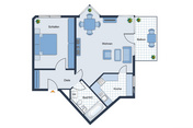Der große Schlafbereich wird über zwei Fenster mit viel Tageslicht versorgt. Über praktische Rollläden lässt sich der Raum abdunkeln. Der optimale Schnitt ermöglicht es Ihnen, sich ganz nach Ihren Vorstellungen einzurichten. Hier lässt sich mühelos ein großes Bett mit zusätzlichem Stauraum kombinieren.