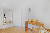 Rechts liegend vom Eingang befinden sich zwei gut geschnittene Schlafzimmer, welche sich hervorragend als Kinder-, Gäste oder Arbeitszimmer nutzen lassen. Beide Räume sind durch die großen Fenster freundlich und bieten aufgrund ihres Schnittes individuelle Einrichtungsoptionen.