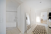 Linker Hand befindet sich das moderne, deckenhoch geflieste Badezimmer, welches mit einer Badewanne sowie einer separaten Dusche und einem Waschmaschinenanschluss ausgestattet ist. Direkt neben dem Badezimmer befindet sich das freundliche Gäste-WC.