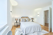 Das geräumig geschnittene Schlafzimmer liegt am anderen Ende des Flurs, direkt gegenüber der Wohnungstür. Genügend Platz für ein großes Bett sowie für einen Kleiderschrank ist gegeben.